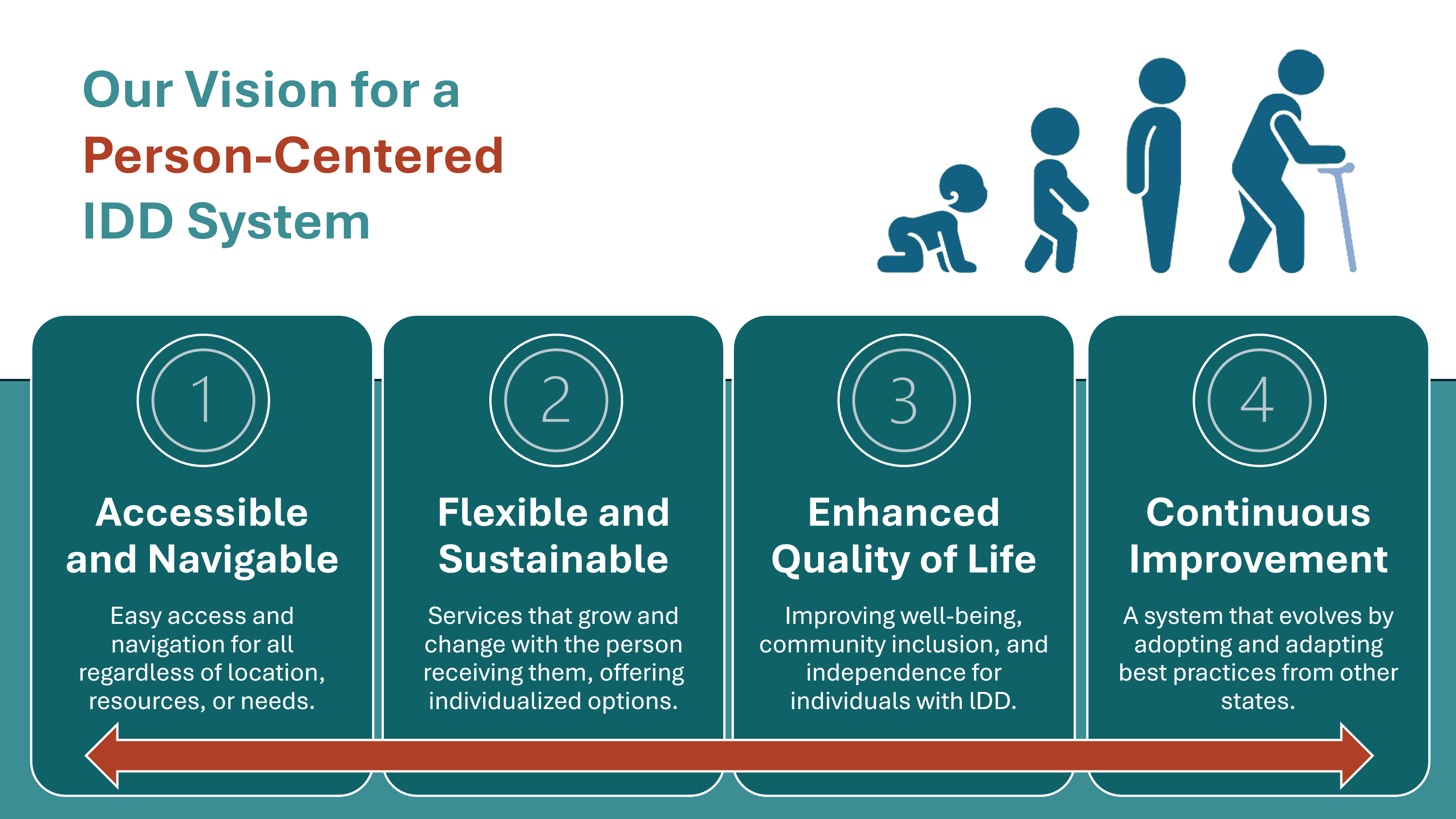 Our mission is simple. We want to foster an Illinois IDD system that meets the needs of every citizen with IDD for their entire lifespan. This includes a system that is easy for people to navigate, that grows with the person, and leads to a better life through continuous improvement.